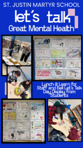 Staff enjoyed a lunch and learn with YCDSB’s Renee Jordan, while Intermediate students creatively crafted BELL Let’s Talk Posters. The focus of many lessons from k-8 were around the theme of taking time for US and learning strategies that help exercise our minds for great mental health.